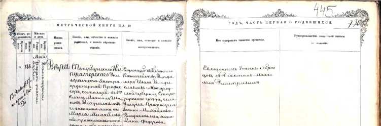 Основываясь на этих данных о примерной дате рождения, известном имени и адресе проживания родителей ребенка (т. е. известной приходской церкви: Входа Господня в Иерусалим на Знаменской площади), можно было приступать к постраничному просмотру метрической книги данной церкви, где и была обнаружена дата рождения и крещения ребенка. Родившаяся 8 марта 1849 г. девочка с символическим именем Надежда была крещена буквально за 4 дня до ареста отца, 1 мая 1849 г., в тревожное для Петербурга время: ночью 23 апреля уже были арестованы два ее родных дяди, Федор и Андрей, отец со дня на день тоже ожидал ареста: