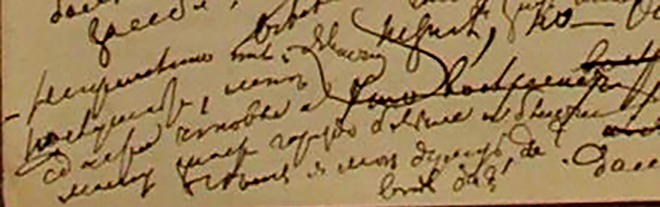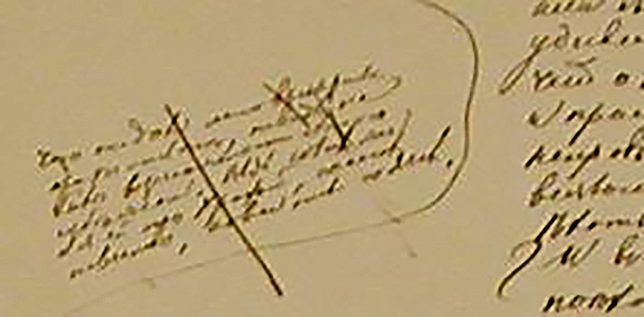 - Вычеркнутая запись-маргиналия (шестая глава второй части):