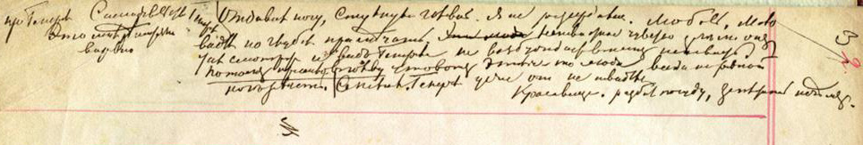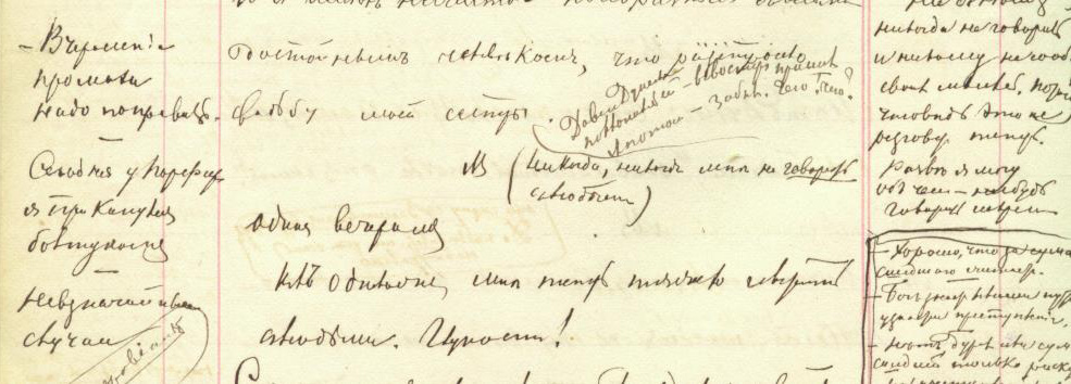 Букву «д» Достоевский часто не прописывает до конца, как в данном случае (ср., например, выше прописанную «д» в слове «движенiе»). Но в окончании прилагательного нет буквы «i», чтобы его можно было прочесть как «горячий». Более того, разговор между Соней и Раскольниковым действительно «гордый»: выше говорится о том, что разговор принял сначала форму «догматического», Раскольников разговаривает как бы нехотя, «полуфразами», как будто произносит мысли вслух («Можетъ и Бога то нѣтъ»). Финальная характеристика в этом блоке записей: «Высокомѣрно съ ней на счотъ этого пункта». На полях слева и справа имеются записи: одна (справа) — гордые, высокомерные, почти насмешливые слова пока еще не раскаявшегося главного героя («Я увѣренъ что вы Богу промолились всю ночь»). Другая (слева) — помета Достоевского, характеризующая «переходное» состояние Раскольникова («NB долго не вѣритъ»).
