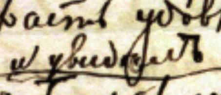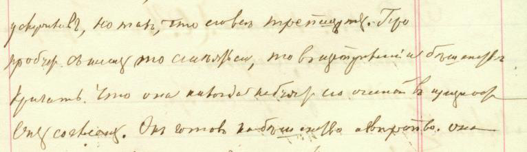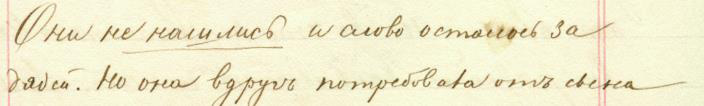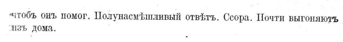 Несмотря на то, что перед нами текст, написанный довольно четким, хотя и убористым почерком, возникло неверное прочтение глагола «увидѣлъ». В данном примере букву «ѣ» закрывает буква «у» с предыдущей строки, но, тем не менее, запись прочитывается — перед нами другое написание буквы «ѣ», тоже характерное для почерка Достоевского, похожее на написание твердого знака: