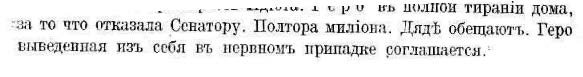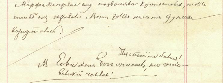 «Марфа Петровна ему позволяла крѣпостныхъ, только чтобы онъ сказывался. Вотъ только насчетъ Дунечки возмутилась./
