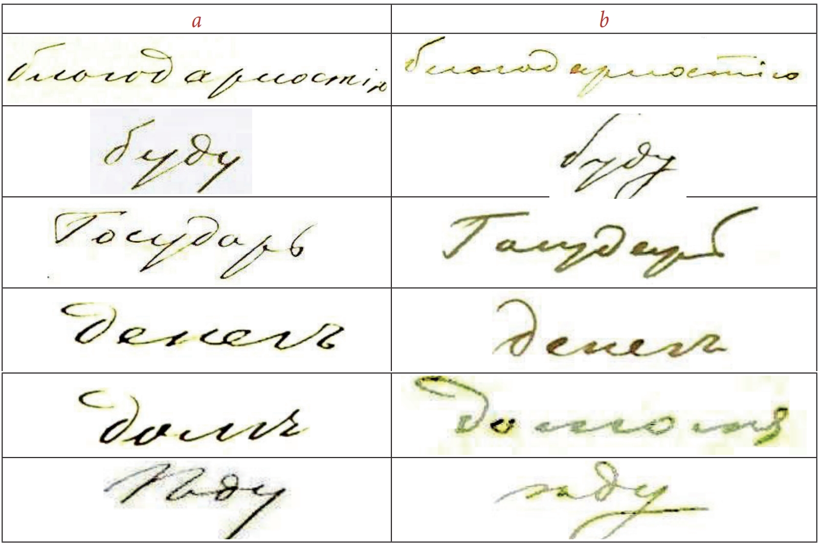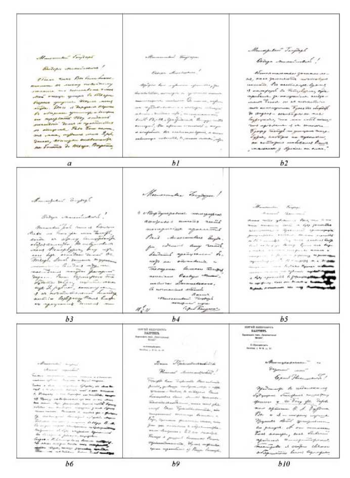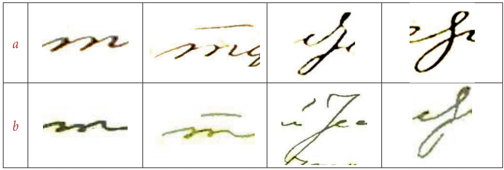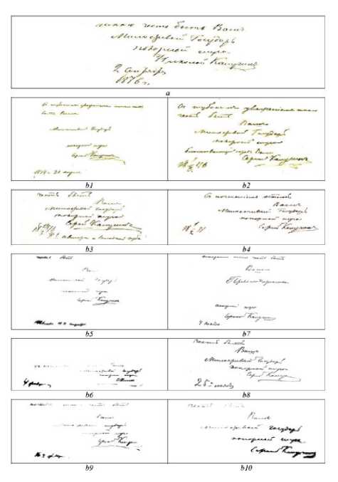 Сергей Федорович Калугин во все периоды своей деятельности был человеком публичным и вел обширную переписку, часть из которой сохранилась в архивах Москвы и Петербурга13. Для анализа мы располагаем фотокопиями десяти писем, совершенно точно принадлежащих руке С. Ф. Калугина14: три письма хранятся в Санкт-Петербурге в Пушкинском Доме и адресованы Ф. М. Достоевскому (от 21 апреля 1874 г., 1 и 29 марта 1876 г.; далее: b1, b2, b3), остальные письма находятся в московских архивах и адресованы Д. В. Григоровичу (от 1 февраля 1881 г.; далее: b4), А. С. Суворину (от 10 сентября 1881 г., 4 и 16 февраля 1882 г. и марта 1884 г.; далее: b5, b6, b7, b8), Н. А. Ермакову (от 4 ноября 1882 г.; далее: b9), С. Н. Худекову (от 25 ноября 1882 г.; далее: b10)15. Предметом же сравнительного анализа будет письмо Калугина-«сына» (от 2 сентября 1876 г.; РО ИРЛИ. Ф. 100. № 29732; далее: а).