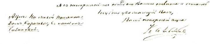 Чтобы развеять могущие возникнуть сомнения, что вообще все окончания писем, особенно не дружеских, а полуофициальных, обращенных к почти незнакомым лицам, писались в XIX в. по определенному шаблону и, следовательно, были однообразны, приведем, для сравнения, образцы концовок писем двух других людей, чтобы показать, что и эта часть письма, несмотря на её кажущуюся формульность, устойчивый характер и ожидаемое единообразие, может служить (и служит) одним из основных идентифицирующих признаков при почерковедческой экспертизе и носит признаки индивидуальности каждого корреспондента.