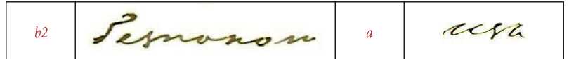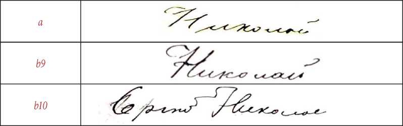 Очевидно сходство всех трех представленных образцов по следующим частным признакам: в букве «Н» в одном из вариантов пишется широкое начальное закругление; горизонтальная уходящая вверх линия может пересекать левый вертикальный элемент, а может, как в подписи «сына», писаться отдельно (ср. такое же написание в начатом неправильно обращении: [Ни]/Сергѣй/); во всех трех письмах отрыв пера при написании имени происходил в одном месте — между буквами «о» и «л».