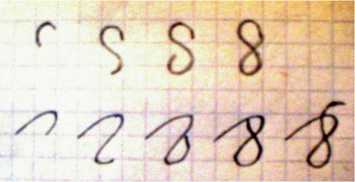 В анализируемых же письмах встречается упрощенный скорописный индивидуальный вариант написания этой буквы, создающийся одним сложным по конфигурации движением без отрыва пера от бумаги: