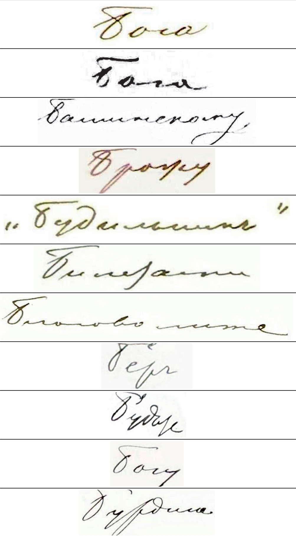 В свете данных обстоятельств и авторство письма «сына», сообщившего о мнимой смерти «папаши», стало вызывать подозрения. Кто же в действительности написал это письмо, если смерть была только инсценировкой и предлогом? Существовал ли вообще этот сын или был придуманным персонажем, а истинным автором выступил всё тот же Сергей Калугин, исчерпавший в своих предыдущих письмах все возможности для просьб от себя лично и решивший прибегнуть к столь неординарному способу получения вспомоществования? Простое возвращение к рукописи письма «Николая Калугина» и внимательное сравнение почерков только укрепило в этой мысли: даже на беглый поверхностный взгляд почерка в этих письмах были схожи. Однако, чтобы уйти от голословных утверждений, основанных на чисто визуальном сходстве или различии почерков10, мы решили обратиться к многолетнему опыту, накопленному отечественной криминалистикой, и их методике проведения почерковедческих исследований [Винберг, Шванкова], [Орлова].