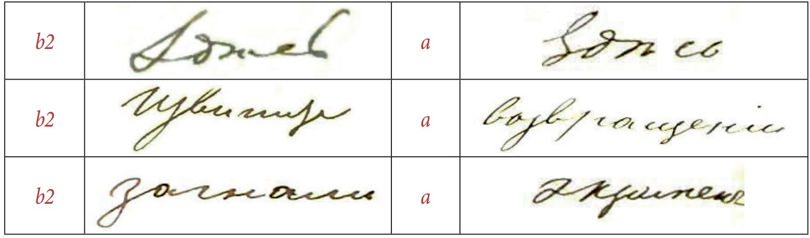 Вчерне были проанализированы особенности начертаний всех встретившихся одноименных строчных и прописных букв во всех представленных образцах писем С. Ф. Калугина и в сравниваемом спорном письме