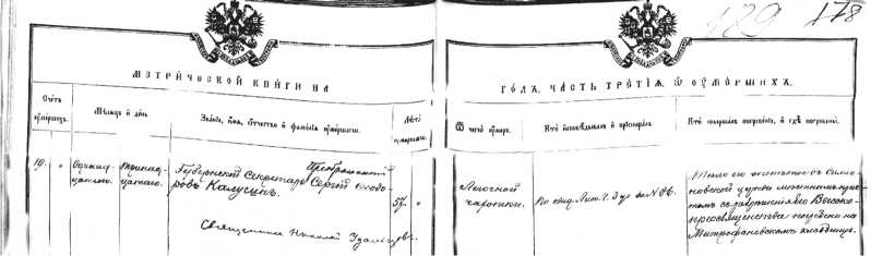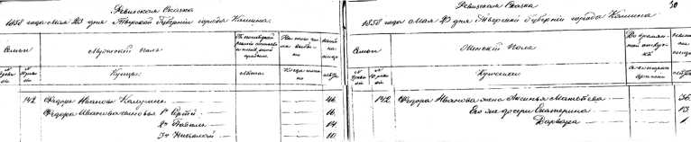 80 Надо сказать, что это указание противоречит и году рождения С. Ф. Калугина, обычно приводимому в биографических справочниках (1842 г.), и возрасту, указанному в ревизии 1858 г. и купеческом свидетельстве 1865 г., и, скорее всего, является ошибочным. Согласно данной актовой записи он должен был бы родиться в 1833–1832 гг. (в то время как его матери в 1858 г. было, по сведениям той же ревизии, всего 36 лет).