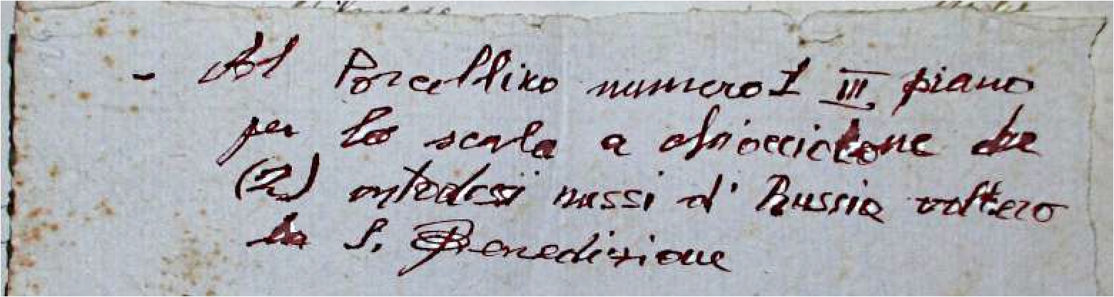 «Al Porcellino numero 1 III piano per la scala a chiocciolone due (2) ortodossi russi di Russia vollero la S. Benedizione» («У Порчеллино № 1 III этаж по винтовой лестнице два (2) русских православных из России захотели <получить> Св. Благословение» (см. Илл. 6)24.