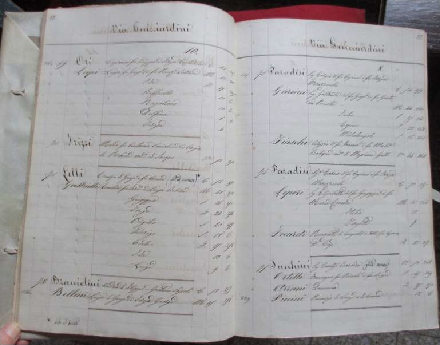 Отыскать флорентийские адреса писателя нелегко. Во всех письмах из Флоренции и других европейских городов к родственникам или друзьям он просил писать ему «до востребования». Уже в Женеве Достоевский понял, что за ним следят агенты III Отделения царской полиции и что его письма вскрываются, прочитываются, а иногда и не доходят до адресатов4. Кроме того, сам отъезд писателя в Европу был связан с тем, что в России ему грозило заключение в долговое отделение за многочисленные обязательства перед кредиторами (см.: [Достоевская А. Г.: 114], [Андрианова: 73]). Вероятно, в 1953 г., во время закладки памятного знака, было известно лишь то, что Достоевский жил «вблизи Palazzo Pitti», о чем писала в своих воспоминаниях его жена, А. Г. Достоевская [Достоевская А. Г.: 236]. О доме на улице Гвиччардини (via Guicciardini, 8) стало известно около тридцати лет назад из статей Н. П. Прожогина [Прожогин, 1981, 1983]5, в которых он пишет об исследованиях, проведенных в «Кабинете Вьёссё» (Cabinetto Vieusseux) при участии Маурицио Босси (Maurizio Bossi), директора Centro Romantico данного Кабинета. В регистрационных каталогах Кабинета была найдена запись рукой писателя, сделанная 16 декабря 1868 г.6, с указанием адреса проживания: «улица Гвиччардини № 8, на третьем этаже» («M-r Theodore Dostoiewsky, via Guicchiardin7 № 8, au second»8*), который не изменился и к 3 февраля 1869 г., когда Достоевский обновил абонемент9. На третьем этаже этого дома жила с прислугой вдова, графиня Барбера Суккини (Barbera Succhini), которая сдавала комнаты, о чем свидетельствуют реестры, обнаруженные в историческом архиве прихода Санта-Феличита (Archivio Storico Parrocchiale di Santa Felicita)10. Исходя из анализа этих документов и записей, хранящихся в «Кабинете Вьёссё», с высокой степенью вероятности можно утверждать, что писатель снимал комнаты у этой графини.