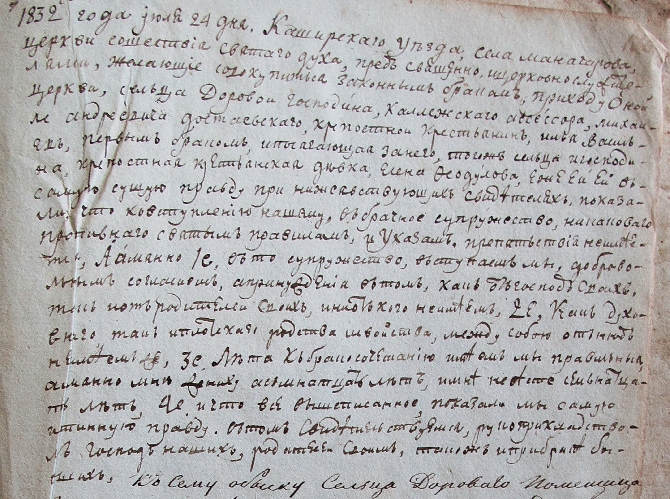 «1832го года iюля 24 дня. Каширскаго уѣзда, села Манагарова, церкви Сошествiа Святаго духа, предъ священно и церковнослужителами, желающiе совокупиться законнымъ бракомъ, приходу Оной церкви, сельца Доровои Господина, Каллежскаго ассессора, Михаила Андреевича Достаевскаго, крепостнои крестьянинъ, Ильа Васильевъ, первымъ бракомъ, и посягающая за него, тогожъ сельца и господина, крепостная крестьанская дѣвка, Елена Ѳеодулова. Еже ей ей въ самую сущую правду при ниже явствующихъ свидѣтеляхъ, показали, что ко вступленiю нашему, въ брачное супружество, никаковаго противнаго святымъ правиламъ, и Указамъ препятьствiя не имѣется. А имянно 1е, въ то супружество, въступаемъ мы, добровольнымъ согласиемъ, а принужденia въ томъ, какъ отъ господъ своихъ, такъ и отъ родителей своихъ, и ни отъ кого не имѣемъ, 2е, Какъ духовнаго, такъ и плотскаго родства и свойства, между собою отънюдь не имѣемъ же, 3е, Лѣта къ бракосочетанiю имѣемъ мы правильныя, а <и>мянно мнѣ жениху асьмнатцать лѣтъ, и мнѣ невѣсте семьнатцать лѣтъ, 4е, и что все вышеписанное, показали мы самую истинную правду. Въ томъ свидѣтельствуемся, рукоприкладствомъ Господъ нашихъ, родителей своимъ, такожъ и при бракѣ бывшихъ».