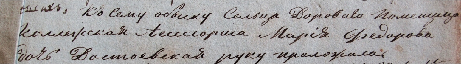 Ниже следуют записи поручителей. Первая написана четким красивым почерком и занимает всего три строки: «Къ Сему обыску Сельца Дороваго Помещица Коллежская Ассессорша Марiя Федорова дочь Достоевская руку приложила»4. Это первый из двух имеющихся в обыскных книгах автограф Марии Федоровны.