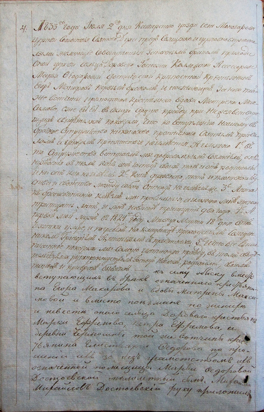 На обороте листа 4 в книге имеется запись под № 4 от 2 июля 1833 г.: «…желающiе совокупиться законнымъ бракомъ прихода оной церкви сельца Дороваго Госпожи Коллежской Ассессорши Марьи Ѳеодоровой Достаевской крѣпостной крестьянинъ Егоръ Макаровъ первымъ бракомъ, и посягающая за него тойже вотчины крѣпостная крестьянка вдова Матрена Максимова…». Далее следует типовой текст о добровольном вступлении в брак, об отсутствии родства между молодоженами, об их возрасте и об истинности их показаний.