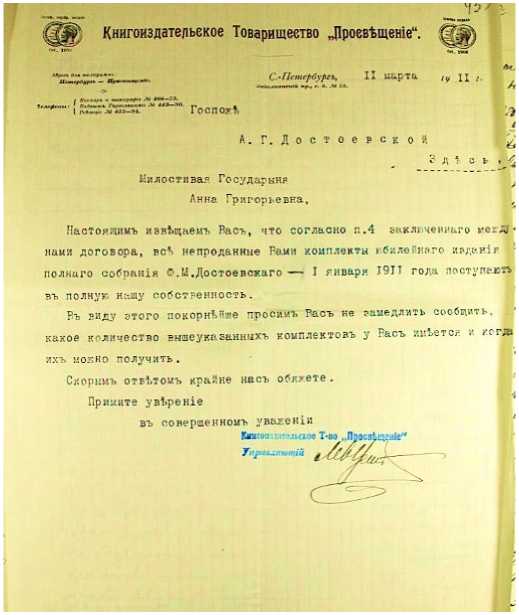 Fig. 8. Notification to A. G. Dostoevskaya from the Book Publishing Partnership “Prosveshchenie”