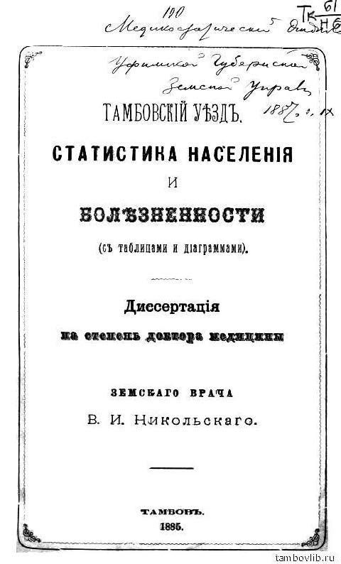 10 [Никольскiй В. И.] Тамбовскій уѣздъ. Статистика населенія и болѣзненности (съ та блицами и діаграммами) : диссертація на степень доктора медицины земскаго врача В. И. Никольскаго / В. И. Никольский. Тамбовъ : Типографія Д. С. Семенова, 1885. 432 с., 48 л. графиков и таблиц.