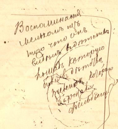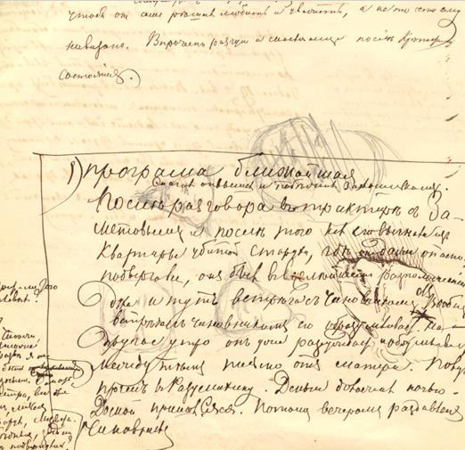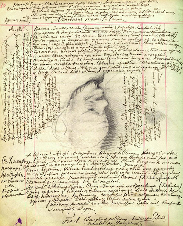Изображение лица полного мужчины, расположенное на странице выше других, повторяется далее — на листе 94 той же тетради (илл. 2) —и, по-видимому, связано с юношеским воспоминанием Достоевского о поездке с отцом и братом из Москвы в Петербург, когда они стали свидетелями ужаснувшей их сцены с избиением фельдъегерем ямщика. Текст, покрывающий рисунок, гласит: «Воспоминания мельком из того, что он видел в детстве: лошадь, которую били в детстве, теленок, которого зарезали, фельдъегерь» (7, 77)3. Это изображение является частью графической композиции, сопровождающей разработку плана романа «Преступление и наказание»4 (илл. 3).