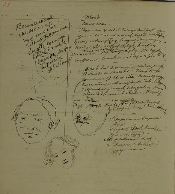 Другими словами, в процессе своего аналитического рисования Достоевский искал нечто важное, поэтому наличие хорошо прорисованного рисунка показывает, что данный путь был трудным для него или просто тупиковым, в то время как слабо прорисованные или незаконченные рисунки свидетельствуют об обратном: идея была найдена и писатель тут же перешел к записыванию эпизода или плана произведения. Подтверждение этому, например, можно обнаружить на листе 94 записной тетради (илл. 3), где план «Преступления и наказания» записан непосредственно после завершения рисунков, изображающих Раскольникова, его мать и сестру, которые иконографически подобны портретам молодого Достоевского, его матери Марии Федоровны и сестры Варвары Михайловны11. Законы творческой автокоммуникации, в рамках которых протекал творческий процесс Достоевского, отменяли рисунки, созданные с целью «кого-то изобразить», одновременно требуя выполнения задачи аналитического осмысления определенного характера, поступков, судьбы или нравственной позиции того или иного изображенного персонажа, варьируя в процессе рисования обозначенные чертами его лица философские и антропологические концепции. Другими словами, писатель составлял иконическую запись, сделанную на языке физиогномики Лафатера-Галля, переводя на язык мимики и физиогномики смыслы, которые затем он переформатировал на язык словесного искусства.