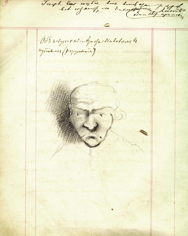 известным изображениям критика. Достоевский в характерной для него манере рисунка-воспоминания разворачивает изображение в левый профиль, как он это делал всегда, рисуя портреты писателей и исторических лиц.