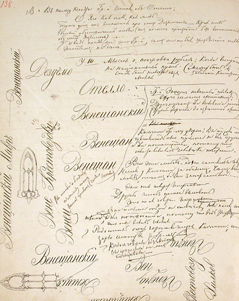 Рисунок выполнен в 1871—1872 гг. и находится среди черновых набросков к роману «Бесы» (часть III, глава 1, главка 4; глава 2, главки 1—3). Заметим, что это не единственная «шекспировская страница» в рукописях Достоевского к данному произведению. То, что в процессе работы писателя не оставляла мысль о драмах Шекспира, подтверждается 138-й страницей другой записной тетради, которая датируется мартом 1870 — маем 1871 г. и содержит подготовительные материалы к «Бесам». На странице — несколько каллиграфических записей названий пьес и персонажей Шекспира: «Венецианский» (4 раза), «Дездемо<на>», «Отелло», «Венецианский мавр», «Крестовоздви<жение>», «Венециан<ский>» (2 раза), «Вене<ция>», «Венец<ия>», «Вен<еция>», «Венеция»13, «Venezia» (2 раза), «Крестовозд<вижение>», «Хилков» (илл. 18)14.