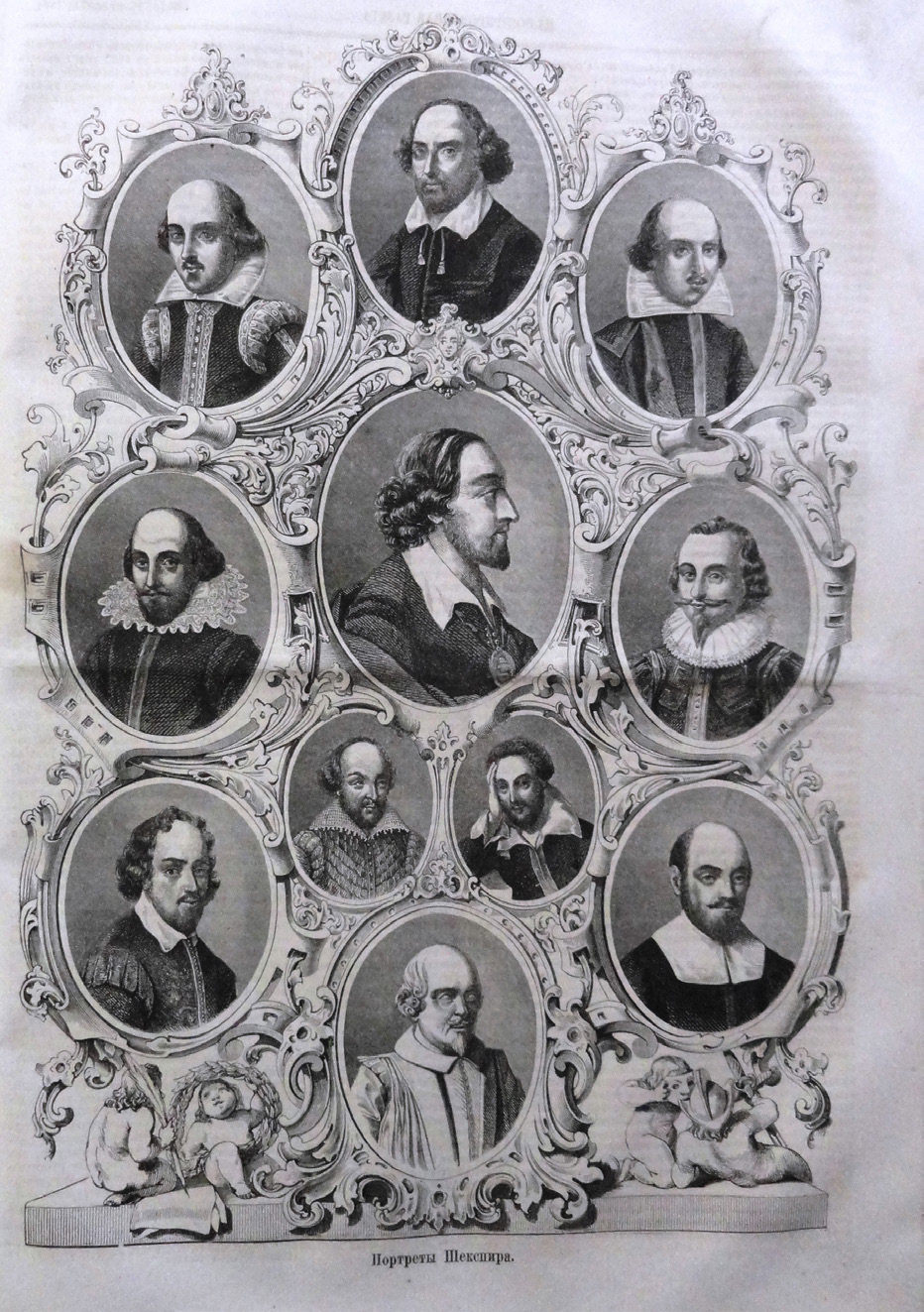 Речь идет о большой статье, посвященной различным изображениям Шекспира. В этой публикации констатируется, что их «столько расплодилось в Европе, что, наконец, никто не знает, который вернее. Мы прилагаем их здесь двенадцать28, но можем сказать, что средний, в профиль написанный, снят с него самого при жизни известным современным живописцем. Он принадлежал русскому писателю И. Е. Великопольскому и не известен в Европе»29. Остальные портреты, опубликованные в издании: «1. Более всех известный и принадлежащий герцогу Букингаму. Он до сих пор более всего печатался при сочинениях поэта. 2. Гравюра Дру-Гоэрта при издании сочинений Шекспира в 1863 году. 3. Портрет, писанный итальянским живописцем Цуккеро. Тогда Шекспиру было 25 лет, и он представлен с лавровой веткою в руках. 4. Портрет голландского живописца Янсена. 5. Миниатюра Гильяра, живописца королевы Елизаветы. 6. Миниатюра Шарля Фиоля. 7. Шекспир, облокотившийся на стол, мехельнского живописца Франсуа. 8. Гравюра Сюмона. 9. Бюст Шекспира работы Джонсона. 10. Портрет живописца Порбюса»30 (илл. 23).