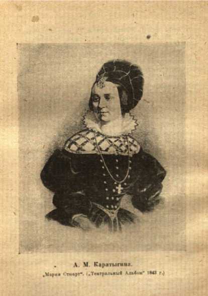 Как свидетельствовал другой рецензент, пьеса, поставленная в сезон 1834– 1835 г., «произвела гораздо болѣе впечатлѣнiя и привлекла въ Александринскiй театръ болѣе порядочную публику. Роль несчастной Шотландской короле- вы очень удалась А. М. Каратыгиной; сцена свиданiя съ Елисаветою раз- шевелила зрителей»15. Роль Марии Стюарт стала одной из самых любимых в репертуаре великой актрисы, так что завершая карьеру, она для прощального спектакля 17 октября 1844 г. выбрала именно эту пьесу16.