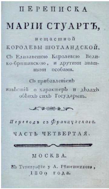 Илл. 3. Титульный лист издания 1809 г. «Переписка Марiи Стуартъ, нещастной Королевы Шотландской, съ Елизаветою, Королевою Велико-британскою, и другими знатными особами»
