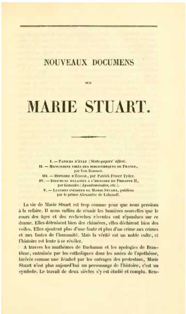 «Мария Стюарт», так и романа Вальтера Скотта «Аббат». Затем при изучении «историче- ских данных» о «жизни и казни» Марии Стюарт в кругозор начинающего писателя попало четырехтомное русское собрание документов о ее биографии 1809 г. и французско-русское издание 1839 г. открытых А. Я. Лобановым-Ростовским в архивах писем Марии Стюарт, ее завещания и отчета о казни. В 1839–1840 гг. вышла беллетризованная биография