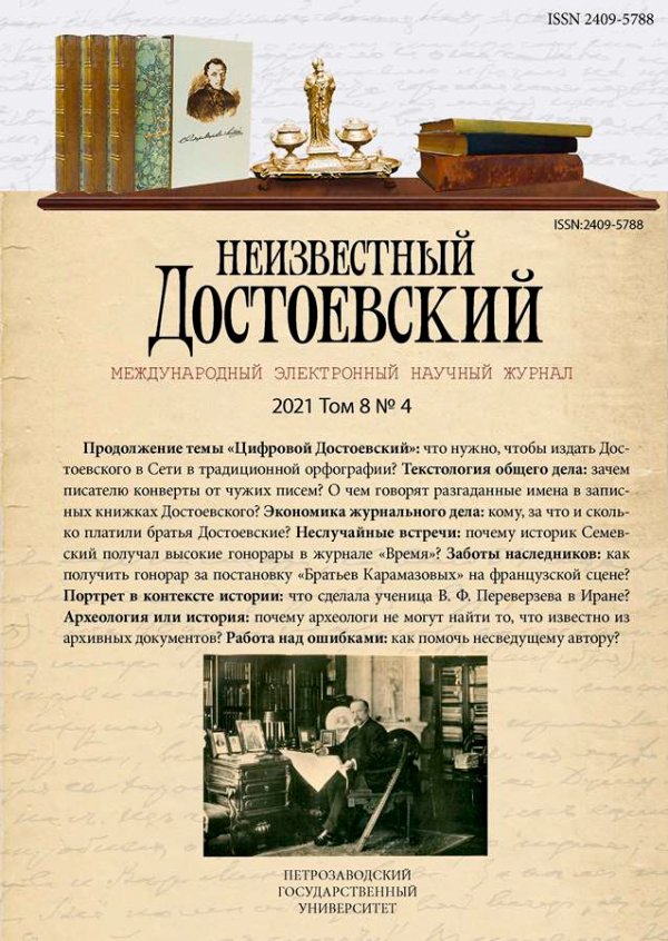 The article presents the history of business and friendly relations between F. M. Dostoevsky and M. I. Semevsky, an employee of the “Vremya” journal and the editor of “Russkaya Starina”, the largest historical journal of the 19th century. Semevsky most likely met Dostoevsky in the early 1860s, when the former became a contributing author of the “Vremya” journal and wrote two large-scale historical essays for the publication: “Tsarina Praskovya” and “The Mons Family.” Dostoevsky was familiar with Semevsky’s works even prior to their personal meetings and intended to polemize with his concept of Peter’s time, as evidenced by the surviving sketches of the writer’s critical review. The idea of a polemic was rejected when Semevsky became the author of the “Vremya” journal. Its editors, the Dostoevsky brothers, appreciated his cooperation and, as confirmed in the fee book, paid him more than many other authors. The meetings of Dostoevsky and Semevsky were reflected in the epistolary legacy and in the notes of Semevsky, which he wrote in the autumn of 1866 after the trial of the revolutionary Nikolai Ishutin. In November 1876, Semevsky gave Dostoevsky the documents for “A Writer’s Diary”, requesting him not to identify the source. The communication between Dostoevsky and Semevsky in the last year of the writer’s life is mentioned in the memoirs of E. N. Opochinin. The article provides an overview of Dostoevsky’s letters of 1854–1879, published in “Russkaya Starina” in 1883–1885, as well as of memoirs of various persons about Dostoevsky, published during the life of the editor and after his death. Archival documents revealing new facts of the biography of Dostoevsky, Semevsky and their contemporaries were used and introduced into scientific circulation in the study.