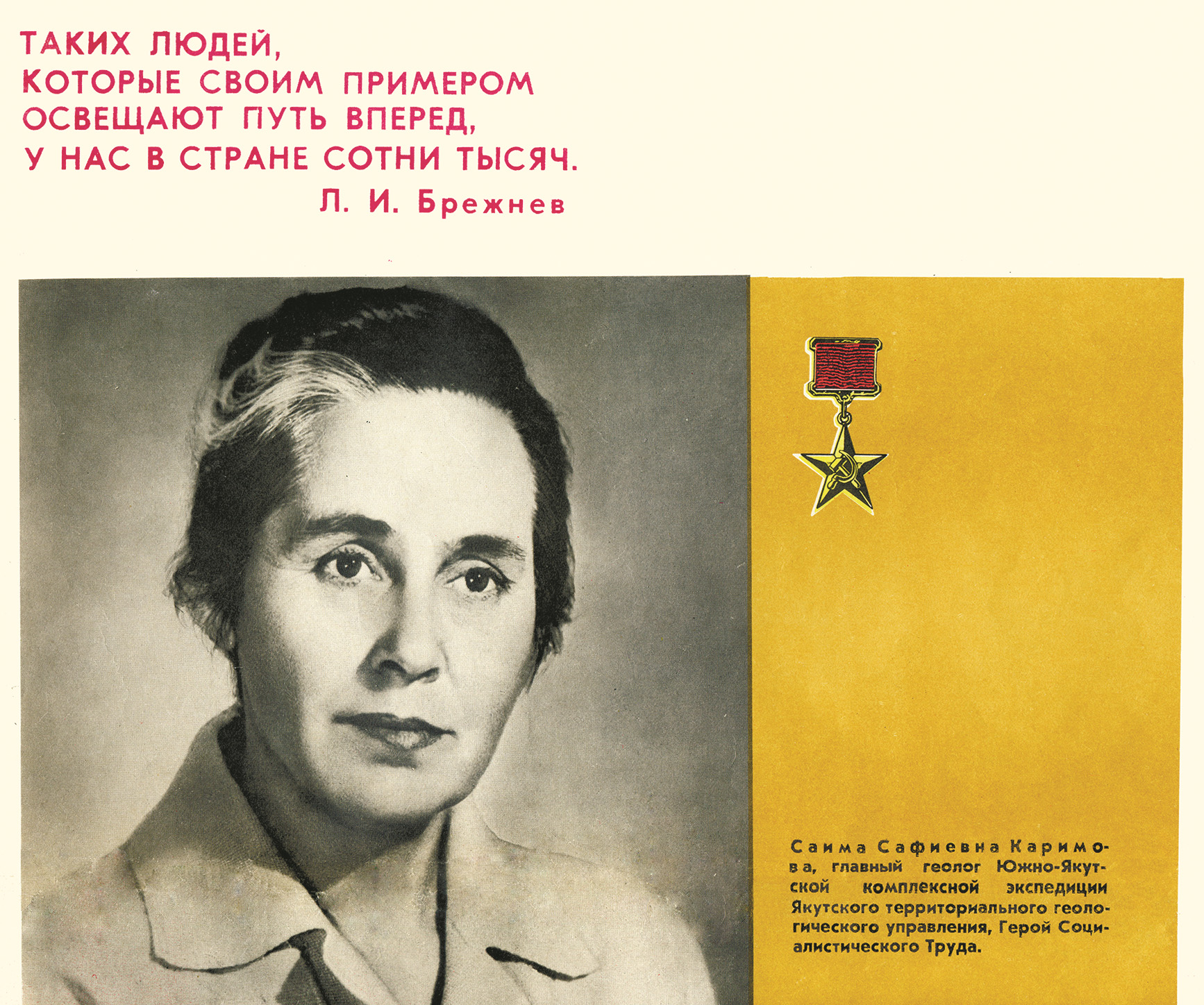 О блестящей карьере Саимы Сафиевны написано достаточно много, ее имя фигурирует в энциклопедиях, онлайн-ресурсах [2, 3, 4], что избавляет от детального анализа ее профессионального пути. Трудовая биография Каримовой имеет довольно типичную траекторию для целеустремленных по-хорошему амбициозных советских людей, входивших во взрослую жизнь в послевоенное десятилетие. После окончания в 1950 г. геологического факультета Казанского государственного университета С.С. Каримова по распределению попала в сибирскую тайгу, где проработала 35 лет, пройдя путь от рядового геолога партии до главного геолога экспедиции. Заслуги Саимы Сафиевны отмечены многими наградами. Среди них орден Трудового Красного Знамени, медаль «За трудовую доблесть», звание заслуженного геолога РСФСР. В 1976 г. она была удостоена самого высокого признания трудовых достижений в СССР – звания Героя Социалистического Труда. В 1982 г. ей была присуждена Государственная премия СССР и ее имя было занесено на Всесоюзную доску почета. С.С. Каримова являлась и почетным жителем города Нерюнгри.