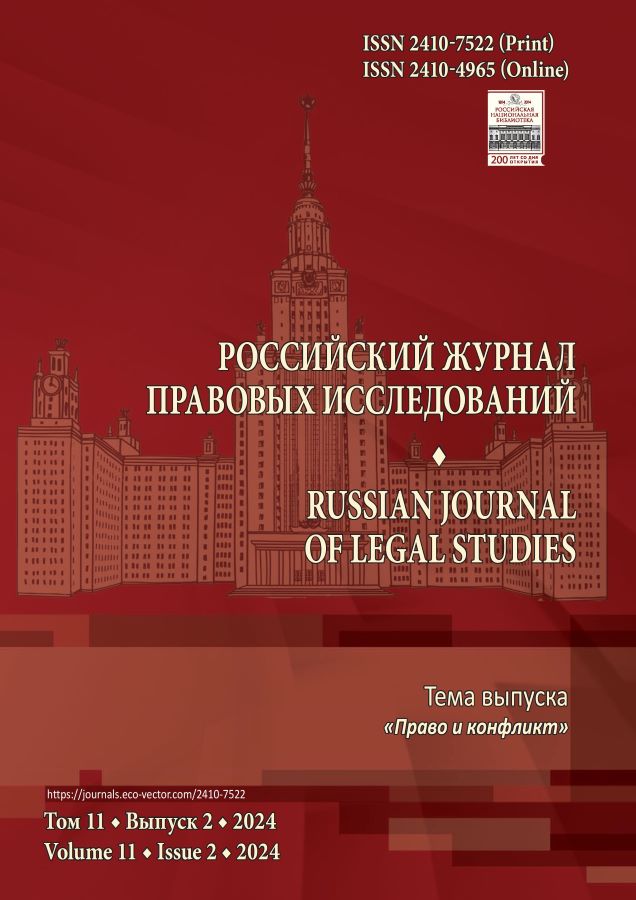 В статье анализируются трактовки юридического конфликта с опорой на зарубежную общую социологию, а также отечественную юридическую конфликтологию. Обращается внимание на неоднозначность объема исследуемой категории ― от чисто нормативистского варианта с указанием исключительно на столкновение интересов в правовом регулировании до более широких трактовок, предполагающих конфликт по поводу соответствующих благ. Авторы указывают на несколько возможных полей юридического конфликта ― противоречия между правосознанием и содержанием реальных правовых отношений, правовыми идеями и элементами правовых отношений, ценностными ориентациями и требованиями законодательства. Юридический конфликт определяется в исследовании как противоречия между субъектами права по поводу реализации, применения, нарушения, толкования норм позитивного права, обусловленные антагонизмом их социально-правовых интересов, а также различиями в отношении к нормам права и правовым ценностям.