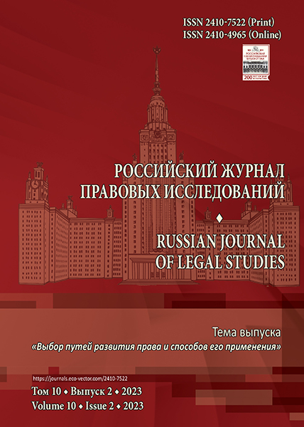 В рамках проводимого исследования применялись диалектический метод познания, общенаучные методы системности, детерминизма, абстрагирования, моделирования, анализа и синтеза, а также специально-юридические методы ― сравнительно-правовой, логико-юридический, контент-анализ документов.