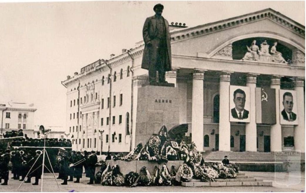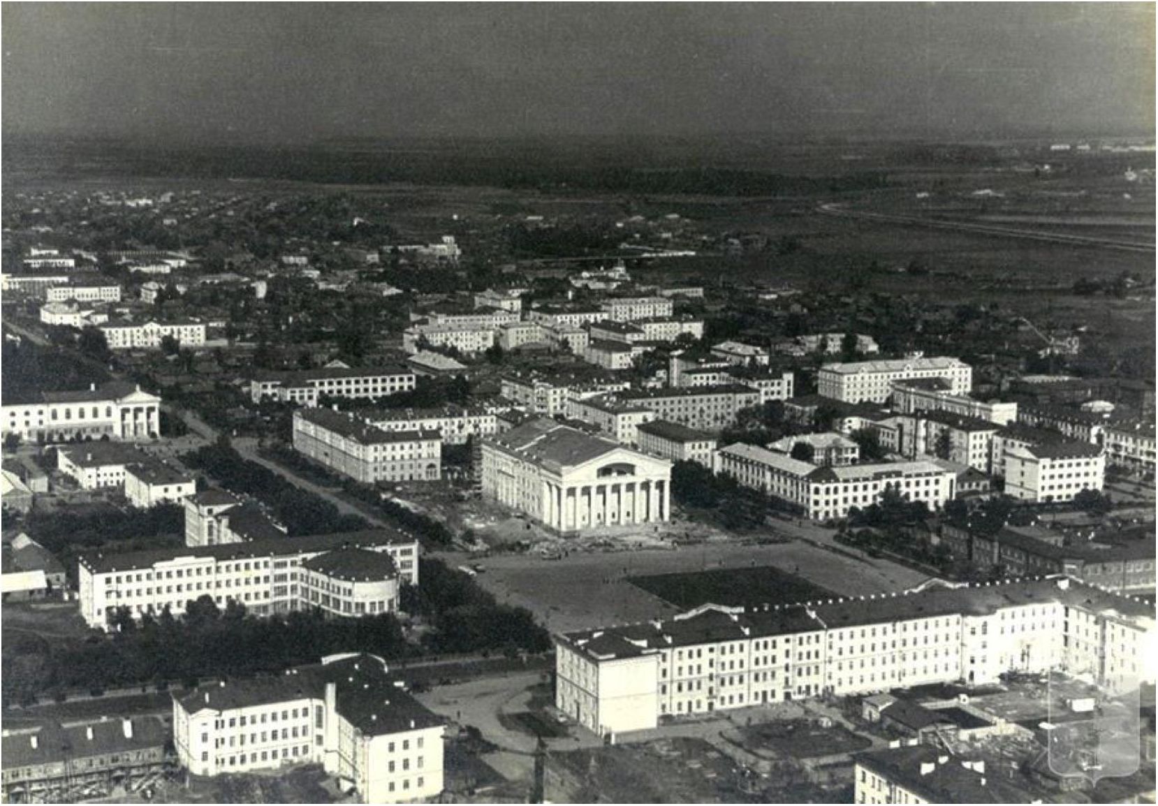 Рис. 1. Фото с сайта olacity: вид на архитектурный ансамбль центральной площади города до 1966 года (стройка театра завершена, но памятник Ленину еще не установлен) / Fig. 1. Photo from the olacity website: view of the architectural ensemble of the city’s central square before 1966 (construction of the theater has been completed, but the monument to Lenin has not yet been erected)