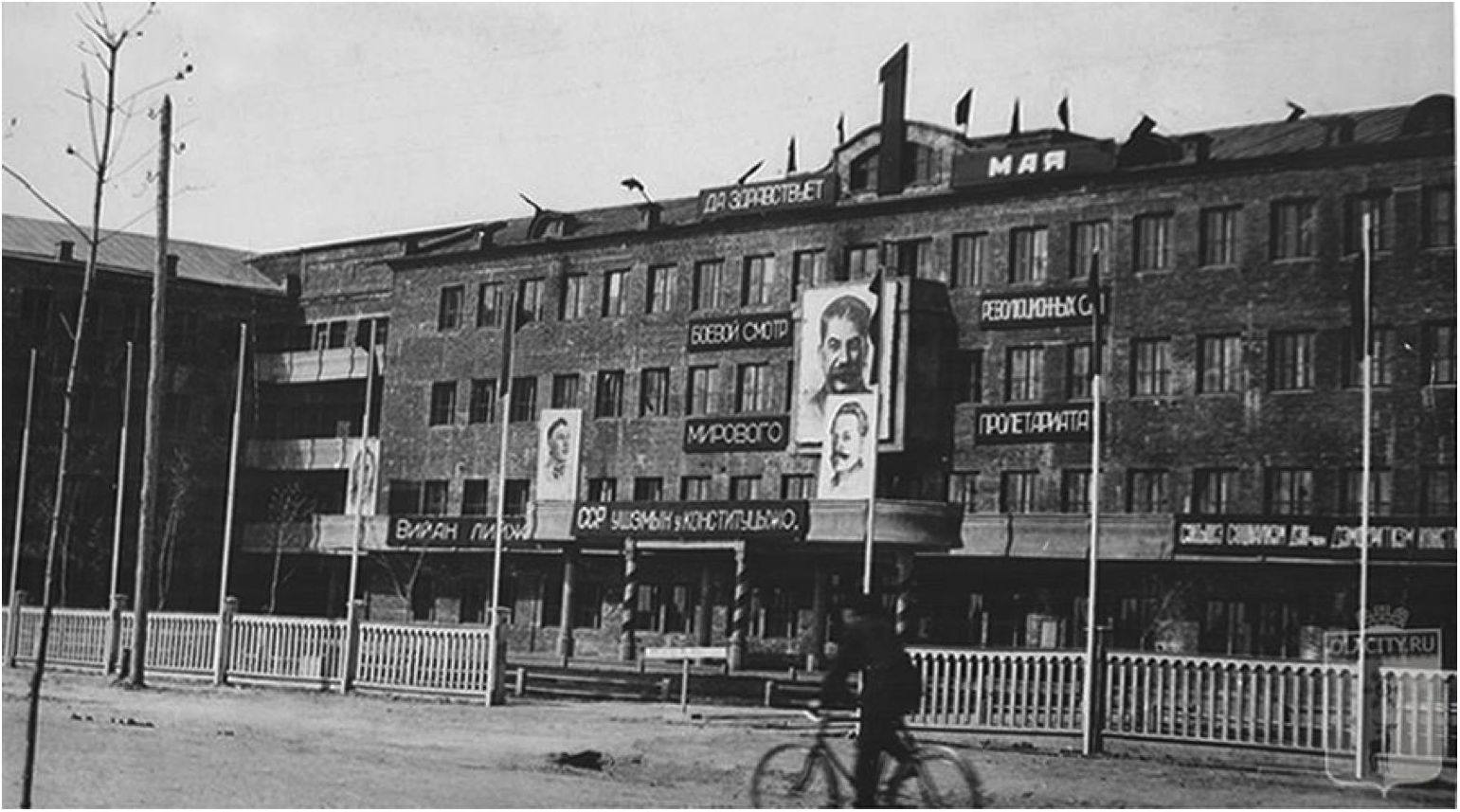 Рис. 12. Фото с сайта olacity: правительственная трибуна установлена напротив Дома Советов по улице Комосомольской, 1966 год / Fig. 12. Photo from the olacity website: the government platform is installed in front of the House of Soviets on Komosomolskaya Street, 1966
