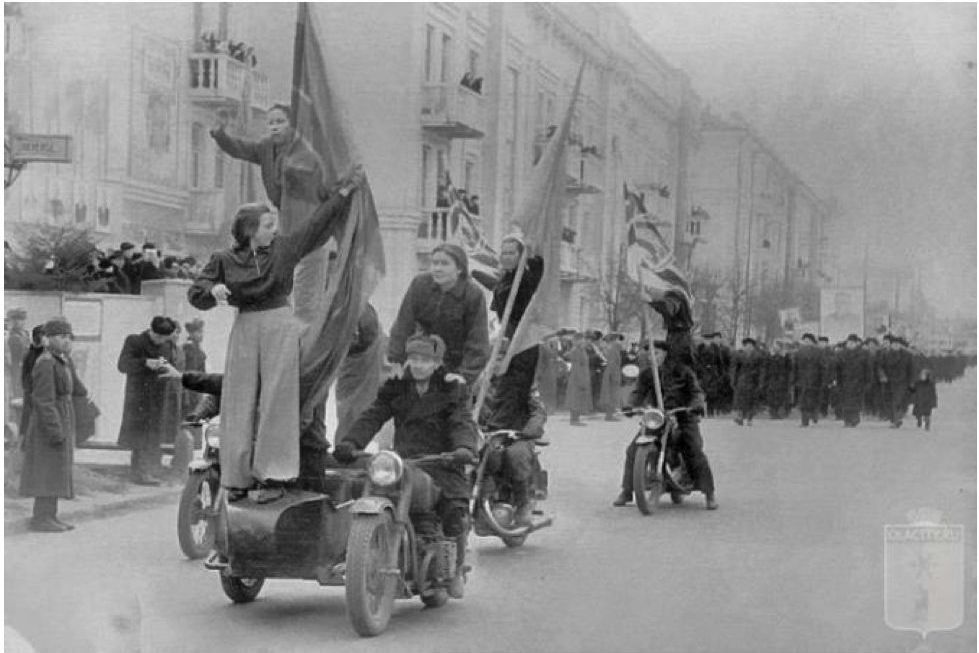 Рис. 11. На фото с сайта olacity: участники мотокружка МГПИ им. Н. К. Крупской на демонстрации напротив правительственных трибун на улице Советской, 1953‒1954 гг. / Fig. 11. In the photo from the olacity website: participants of the motor club of the Mari State Pedagogical Institute named after. N. K. Krupskaya at a demonstration in front of the government stands on Sovetskaya Street, 1953‒1954