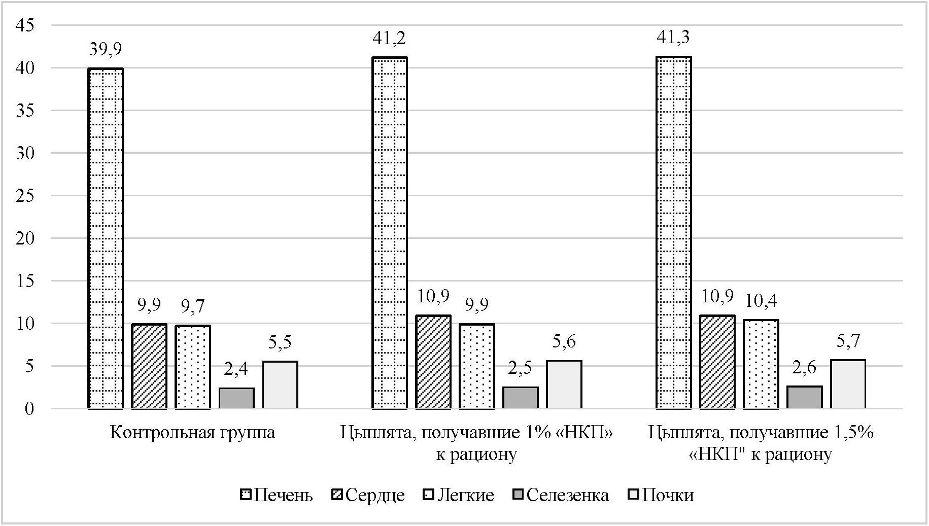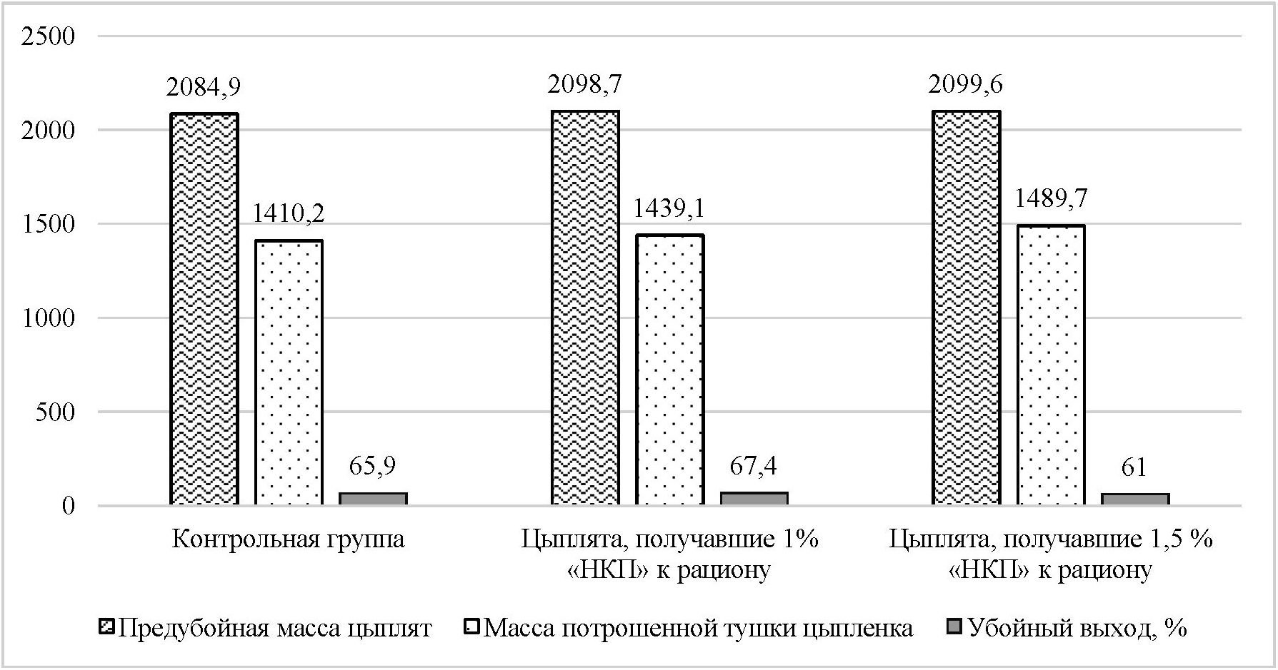 Research results. The weighing results showed that the post-mortem live weight of chickens in the control group was 2098.74±1.267. The weight of the chickens of the second experimental group, which received 1 % of the complex preparation “NKP” in their diet, was 14.01 g (p<0.001) higher than their control peers in terms of this indicator, and the weight of the third experimental group was 15.05 (p<0.001).
