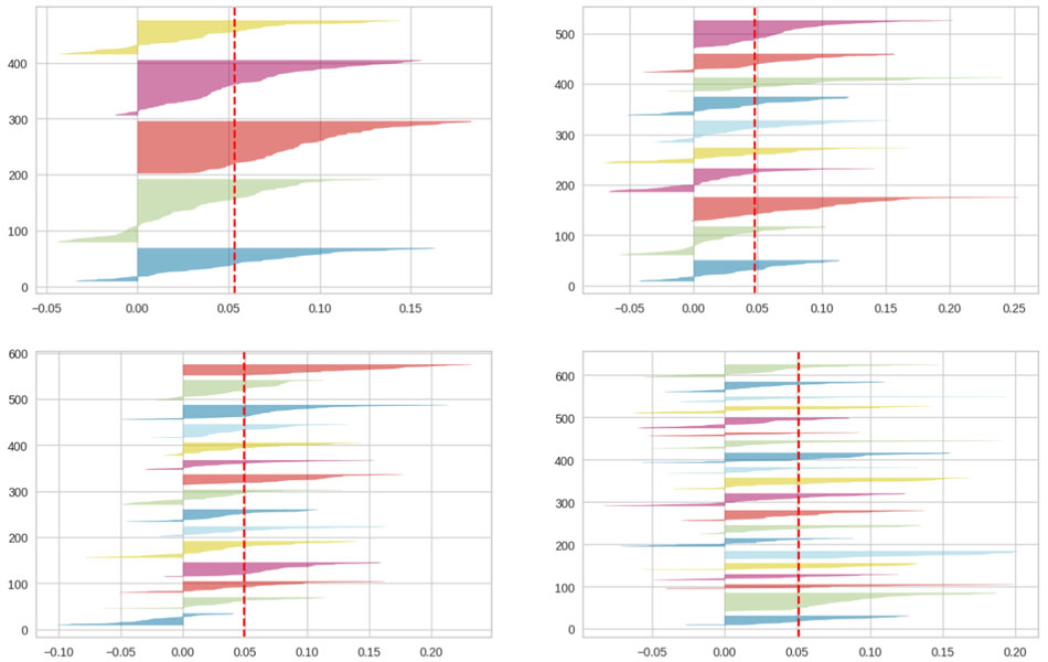 На рисунке 4 значение кластеров 5 и 10, выглядят лучше, в том смысле, что оценка силуэта кластера больше среднего значения для каждого кластера. Для значений 15 и 20 разбиение не оптимально, так как присутствуют кластеры с оценкой меньше среднего, есть большие колебания в размере графика. На рисунке 5 приведена визуализация разбиения на кластеры для k = 5, 10, 15.