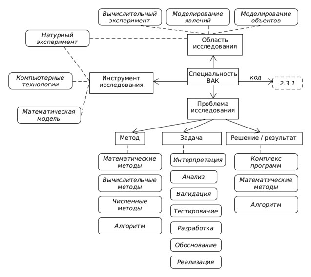 На рисунке 9 представлен фрагмент информационной модели специальности ВАК, которая включает свойства «Область исследования», «Предмет исследования», «Инструмент исследования». Анализ паспортов ВАК позволил выделить эти свойства, как общие для всех рассматриваемых специальностей. Некоторые конкретные значения этих свойств из специальности 1.2.2 приведены на рисунке 9.