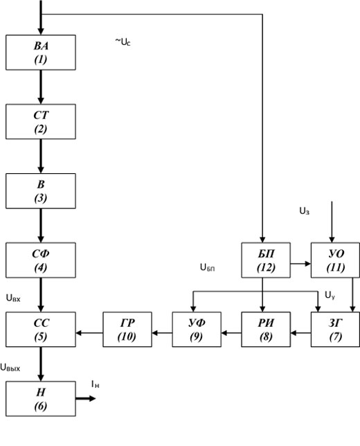 Функциональная схема ЧИП [2] представлена на рис. 1, где обозначено: ВА – вводной автоматический выключатель, СТ – силовой трансформатор, В – силовой выпрямитель, СФ – сглаживающий фильтр, СС – силовая схема преобразователя, Н – нагрузка преобразователя, БП – блок питания системы управления, ЗГ – задающий генератор импульсов, УО – управляющий орган, РИ – распределитель импульсов по каналам управления, УФ – усилитель-формирователь импульсов управления, ГР – устройство гальванической развязки, ~Uc – напряжение питающей сети переменного тока, Uвх – входное напряжение силовой схемы преобразователя, Uвых – выходное напряжение преобразователя, Uбп – выходное напряжение блока питания, Uу – выходное напряжение управляющего органа, Uз – задающее напряжение.