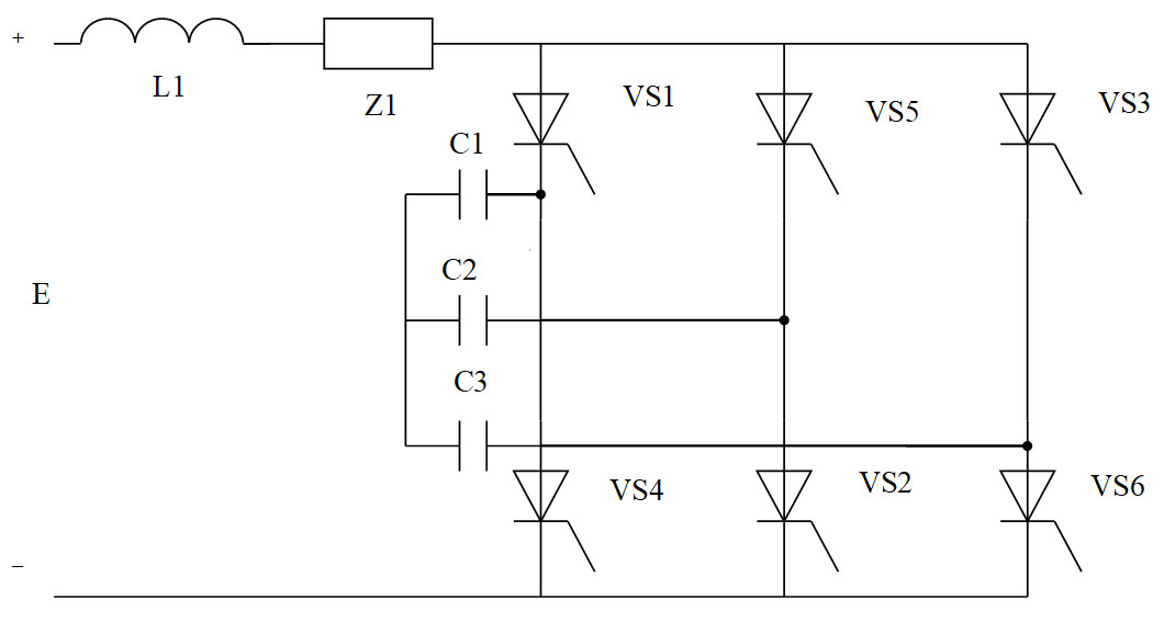 Резонансный инвертор имеет: трехфазный мост из тиристоров VS1, VS2, VS3, VS4, VS1, VS2; коммутирующие конденсаторы C1, C2, C3; коммутирующий дроссель L1; источник питания E; нагрузку Z1.