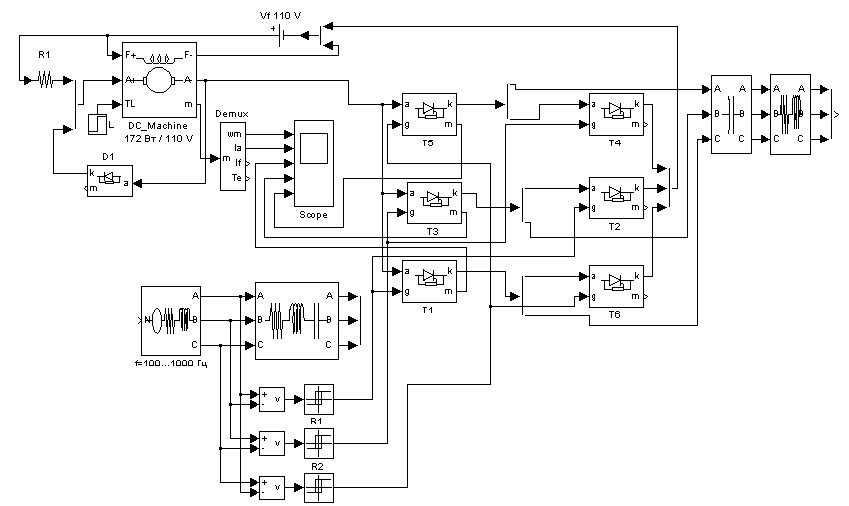 В состав модели входят: источник постоянного напряжения (V1); силовая часть (тиристоры T1 – T6); задающий генератор (f); распределитель импульсов управления (R1 – R2); устройство задания нагрузки (L); осциллограф (Scope); двигатель постоянного тока с независимым возбуждением (DC Machine).