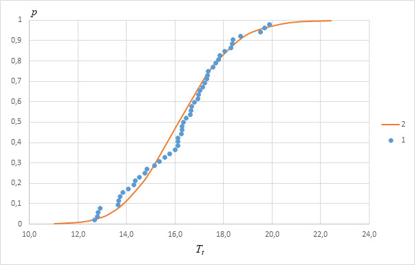 Рис. 1. Эмпирическая функция (1) и распределение Пирсона III типа (2) для средних многолетних температур воздуха с 7 по 26 июня по данным г. Иркутска за 1971-2023 гг.