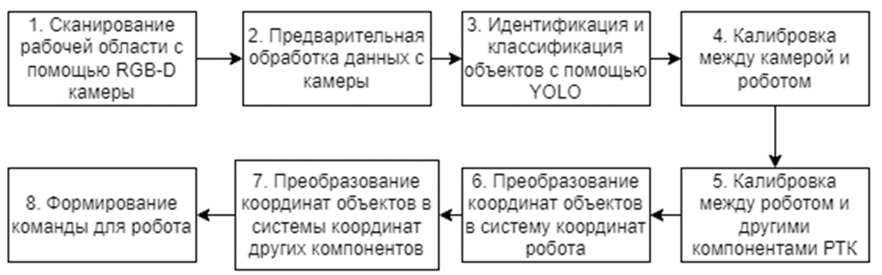 Первоначально рабочее пространство сканируется с помощью RGB-D камеры, установленной над рабочей зоной робота. Такая установка обеспечивает стабильное положение камеры и полный обзор области, где робот взаимодействует с объектами. Полученные от камеры данные проходят предварительную обработку. Изображения фильтруются с помощью фильтра Гаусса для удаления шумов, а карты глубины обрабатываются билатеральным фильтром. Коррекция оптических искажений осуществляется с настройкой параметров внутренней калибровки камеры, что повышает точность последующего анализа. Далее производится идентификация и классификация объектов с использованием модели YOLOv5, обученной на пользовательском наборе данных, включающем объекты, с которыми взаимодействует робот. Классы объектов включают заготовки и детали различных типов, оснастку и инструменты, компоненты РТК, а также элементы безопасности. Входными данными для модели служат отфильтрованные RGB-изображения, а выходными – координаты ограничивающих рамок объектов и их классы. Это позволяет системе определить, какие объекты присутствуют в рабочей зоне и где они находятся на изображении. После идентификации и классификации объектов возникает необходимость преобразовать их координаты из системы координат камеры в систему координат робота, а затем в системы координат других компонентов РТК, с которыми робот должен взаимодействовать. Для этого используется метод калибровки "eye-to-hand" без применения специальных калибровочных объектов.