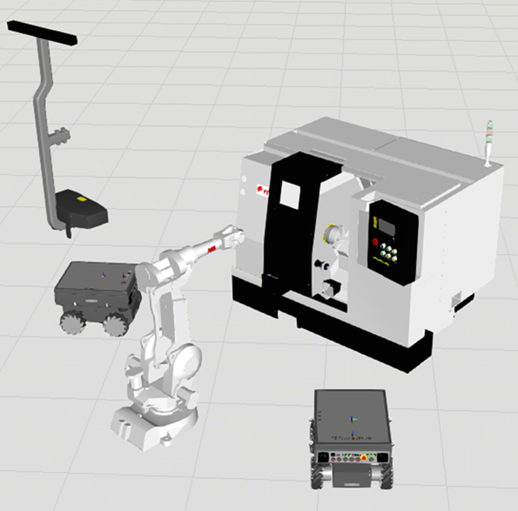 - шестиосевой промышленный робот-манипулятор с точностью позиционирования схвата в модели 0.1 мм. и рабочей зоной, охватывающей область взаимодействия с конвейером и станком с ЧПУ;