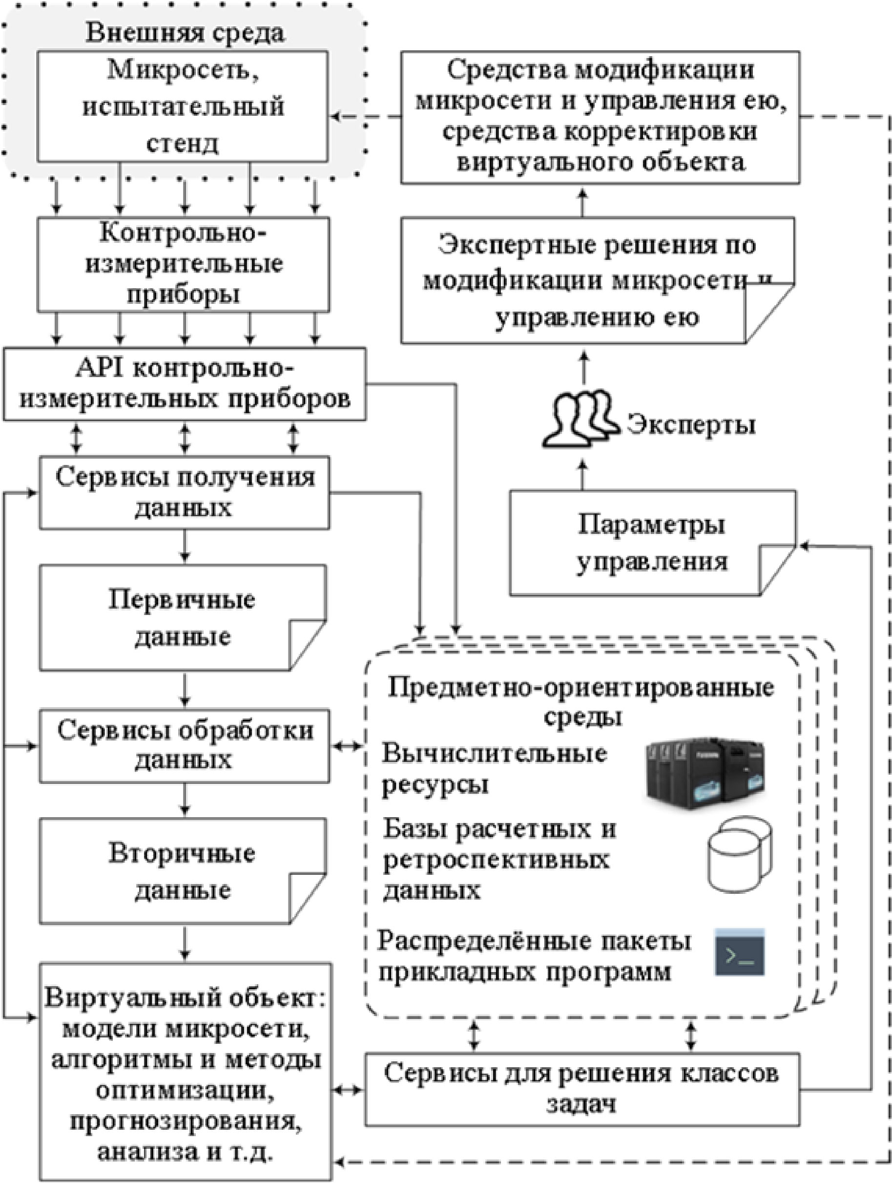 Для организации и проведения исследования системных свойств микросети цифровой двойник использует одну или несколько предметно-ориентированных сред (ПОС). Под ПОС понимается совокупность программно-аппаратных средств, позволяющих её конечным пользователям решать один или несколько определённых классов задач некоторой предметной области (рис. 1). В состав ПОС входят: