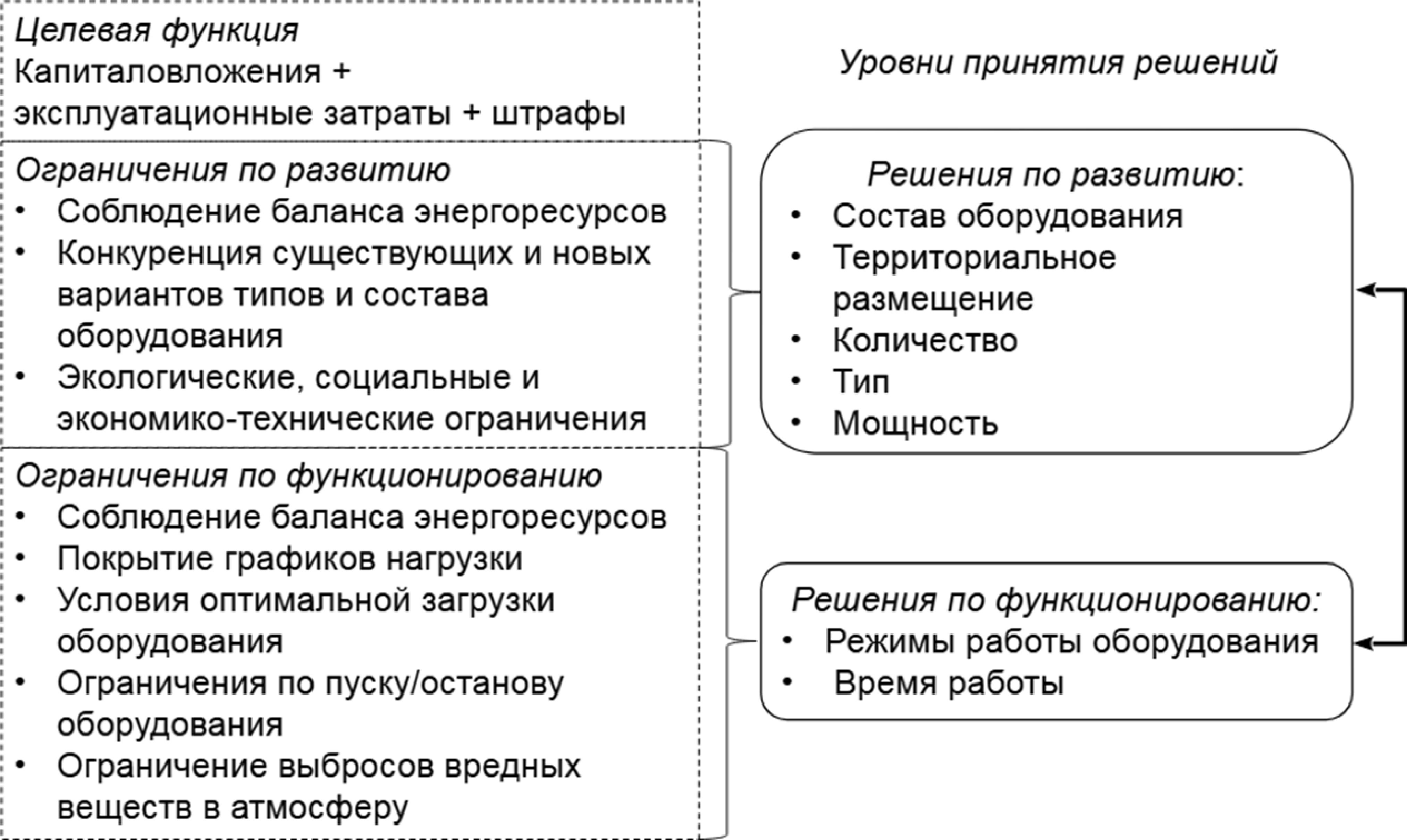 где C – функция экономических затрат на функционирование и развитие ЭК, – искомая последовательность состояний ЭК, – вектор параметров ЭК, описывающий его состояние в интервал . Неравенства в (2) и равенства в (3) представляют разнообразные требования к функционированию и развитию ЭК.