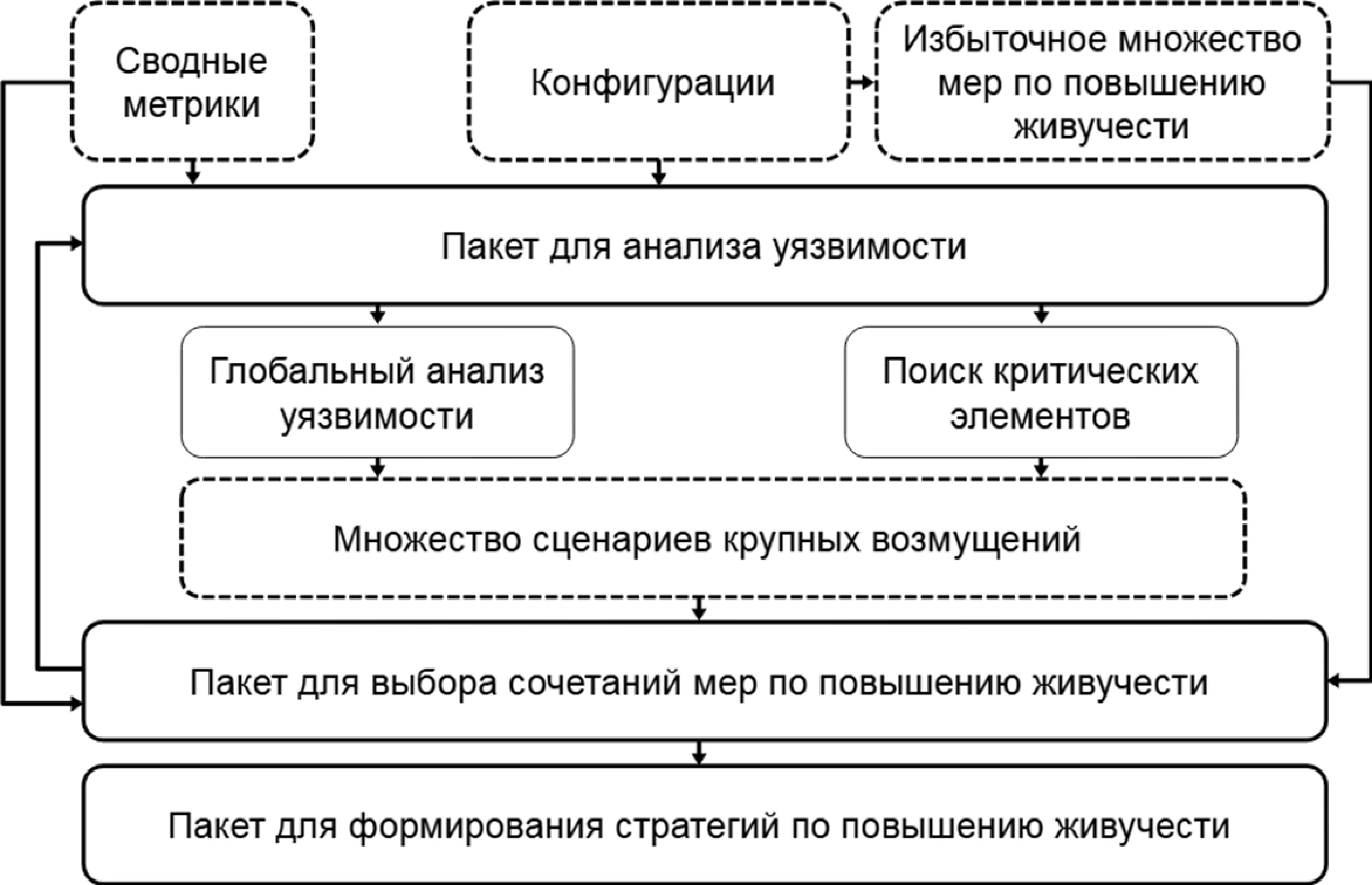 На выходе РППП для оптимизации живучести ЭК выдаёт эффективные комбинации мер, которые обеспечивают ЭК максимальную живучесть в условиях функционирования и развития, создаваемых заданным множеством крупных возмущений. Получив такие комбинации мер для нескольких разнородных множеств крупных возмущений, далее можно провести их многокритериальный анализ и построить стратегии повышения живучести ЭК, которые определяют порядок и время реализации отобранных комбинаций. Пакет для формирования стратегий по повышению живучести (см. рис. 3) на основе динамического программирования в виде многоэтапного процесса принятия решений позволяет выполнить эту задачу.
