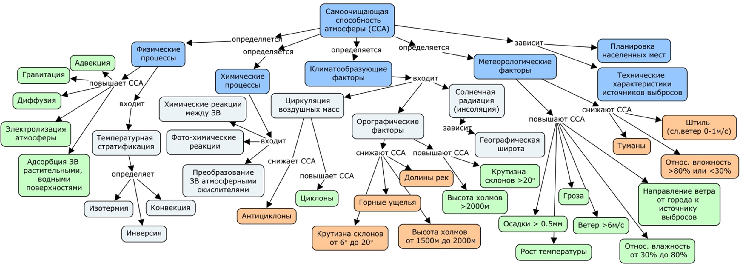 1. Онтологическое моделирование процессов самоочищения и рассеивания ЗВ атмосферой. Известно, что на качество атмосферного воздуха (АВ) влияют не только объемы промышленных выбросов ЗВ, но и технические характеристики источников выбросов, планировка населенных пунктов, физико-химические процессы, метеорологические и топографические условия, климатообразующие и орографические факторы, которые способствуют эффективному рассеиванию ЗВ или их накоплению в околоземных слоях АВ [6, 8-17]. На рис. 5 представлена онтология факторов, влияющих на ССА.