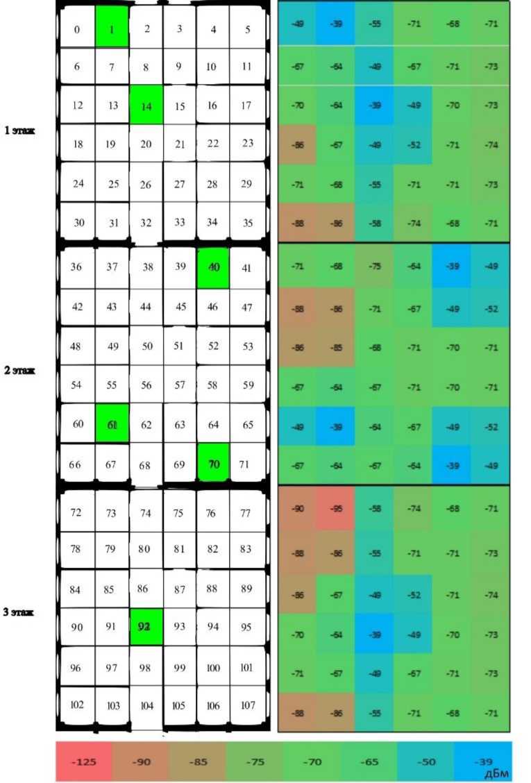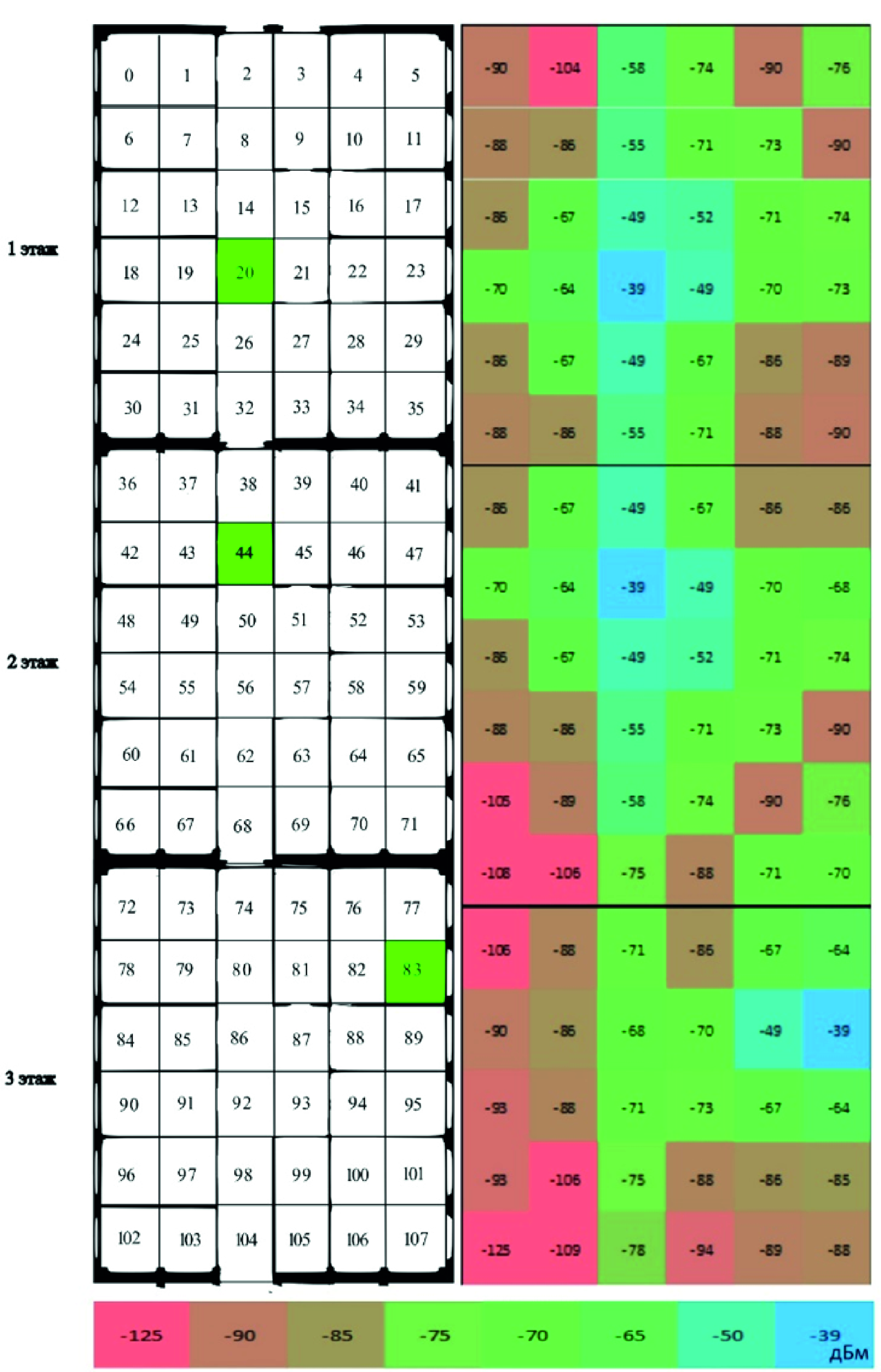 При таком количестве хабов и их расстановки достигается практически полная зона покрытия, но при этом имеются несколько зон со слабым уровнем сигнала (≤ –100 дБм), что является недостаточным для связи с сенсорными устройствами. Для решения этой проблемы в программу было добавлено ограничение на минимальный уровень мощности сигнала (≥ –100 дБм) для всей рассматриваемой зоны покрытия в здании. Как следствие введенного ограничения, увеличилось количество хабов. На рис. 4 представлена схема оптимальной расстановки шести хабов и тепловая карта уровней мощности сигнала в каждой клетке. При анализе тепловой карты видно, что уровень мощности сигнала во всей области покрытия не менее –95 дБм.