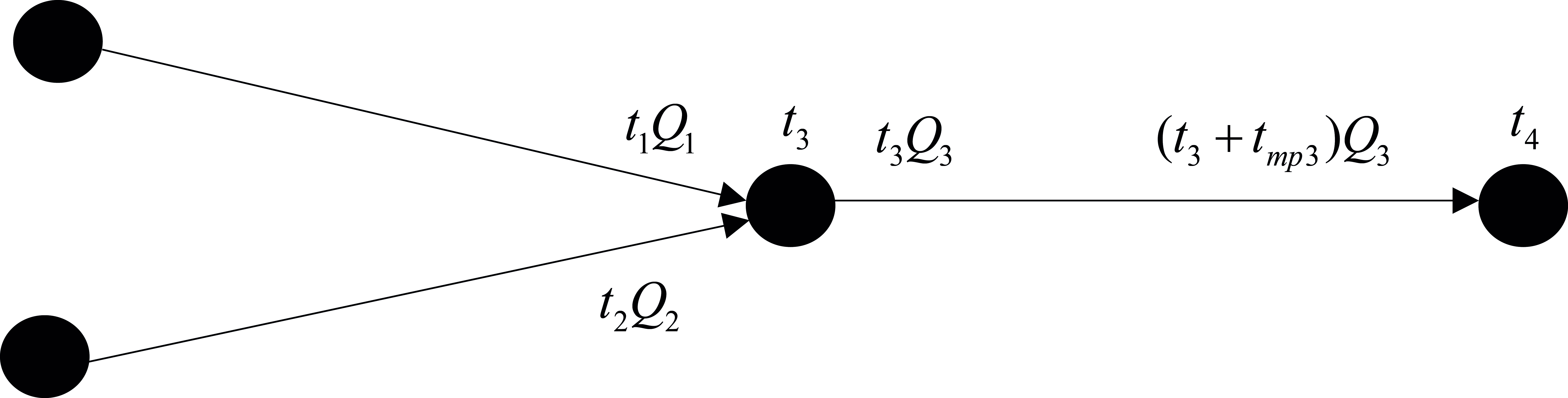 В общем случае для определения возраста воды необходимо провести расчет потокораспределения [38] (для определения расходов на участках) и принять предположение, что в узлах сети происходит полное смешение потоков. Тогда для узла схода потоков (рисунок 2) возраст исходящего потока может быть вычислен по формуле (3), а время транспорта воды по участку определяется скоростью воды (формула 4).