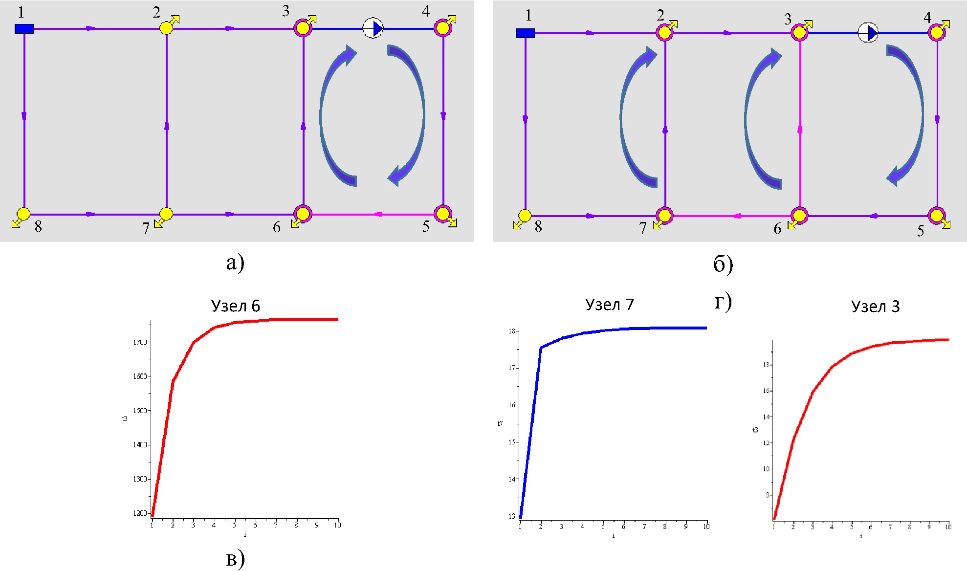 - Примеры расчета возраста воды в сетях с КЗЦ. Представленный алгоритм был реализован в виде программного модуля и подключен к разработанному и развиваемому в ИСЭМ СО РАН ИВК «АНГАРА-ВС» [39, 40]. На рисунке 4 представлены тестовые расчетные схемы с одним (рисунок 4.а) и двумя (рисунок 4.б) КЗЦ (схемы отличаются длинами участков и располагаемым напором на насосной станции). На схемах выделены узлы, входящие в КЗЦ и хорды. Изменение возраста воды в узлах схода потоков в процессе работы алгоритма для приведенных сетей представлены на рисунке 4 (в-г). Для сетей с 1 КЗЦ алгоритму достаточно 3-4 итерации, чтобы оценить возраст воды. Сеть с двумя контурами требует порядка 6 итераций, т.е. с ростом числа контуров число итераций возрастает.
